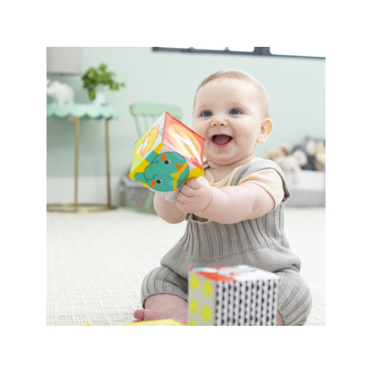 Omyvatelné kostky s krásnými ilustracemi zvířátek ve výrazných kontrastních barvách jsou vhodné pro použití ve vaně i jako první kostky pro stavění věží a společné vyprávění o zvířátkách, barvách i číslech. Vhodné pro děti od narození.