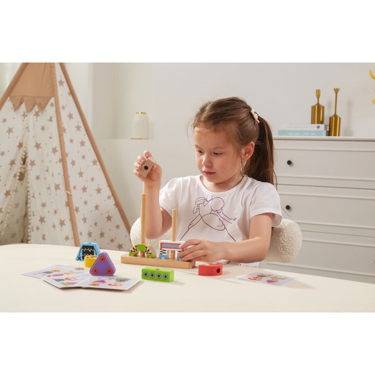 Celá hračka je vyrobena z bukového dřeva s měkkými hranami a je natřena netoxickými barvami v tlumených barvách, které upoutají pozornost a podpoří hru a zároveň poskytnou spoustu zábavy.