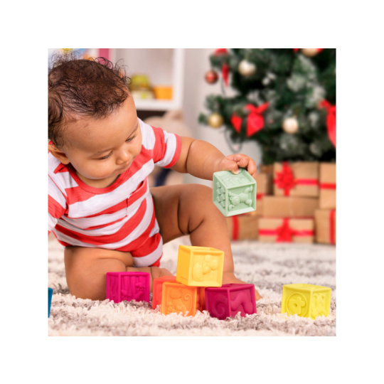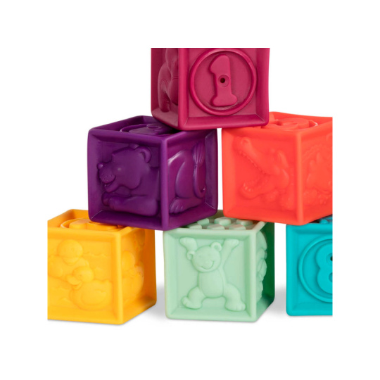 Deset různobarevných kostek s písmeny a zvířaty One Two Squeeze™ od B. toys. Kostky jsou vyrobeny z měkkého plastového materiálu a po zmáčknutí pískají. Různorodé textury kostek lákají ke zkoumání rukama i ústy, později si dítě s kostkami bude házet, stavět z nich, učit se písmenka a názvy zvířátek. Taška na zip s držadlem usnadňuje uklízení i přenášení. Taška textilního vzhledu je vyrobena z recyklovaného polypropylenu. Taška může být používána i na jiné hračky, malovací potřeby apod. Vhodné pro děti od 6 měsíců.
