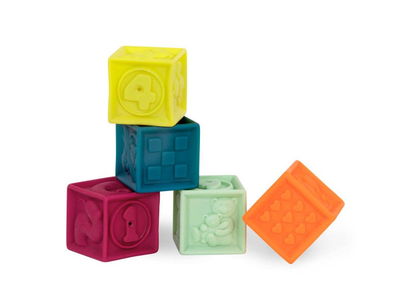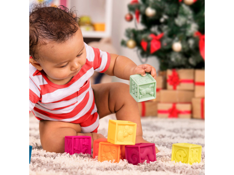 Deset různobarevných kostek s písmeny a zvířaty One Two Squeeze™ od B. toys. Kostky jsou vyrobeny z měkkého plastového materiálu a po zmáčknutí pískají. Různorodé textury kostek lákají ke zkoumání rukama i ústy, později si dítě s kostkami bude házet, stavět z nich, učit se písmenka a názvy zvířátek. Taška na zip s držadlem usnadňuje uklízení i přenášení. Taška textilního vzhledu je vyrobena z recyklovaného polypropylenu. Taška může být používána i na jiné hračky, malovací potřeby apod. Vhodné pro děti od 6 měsíců.