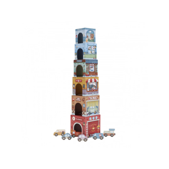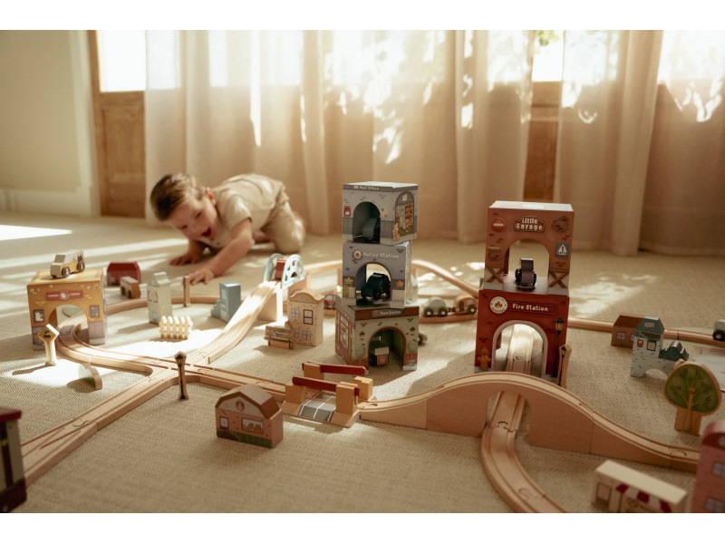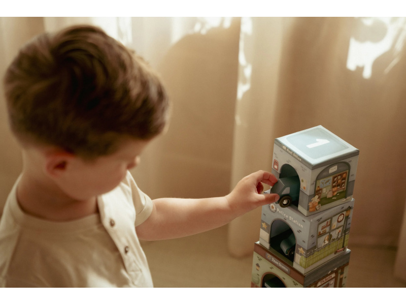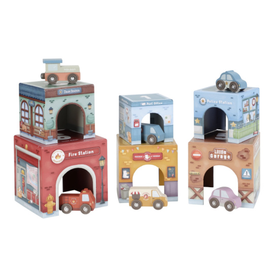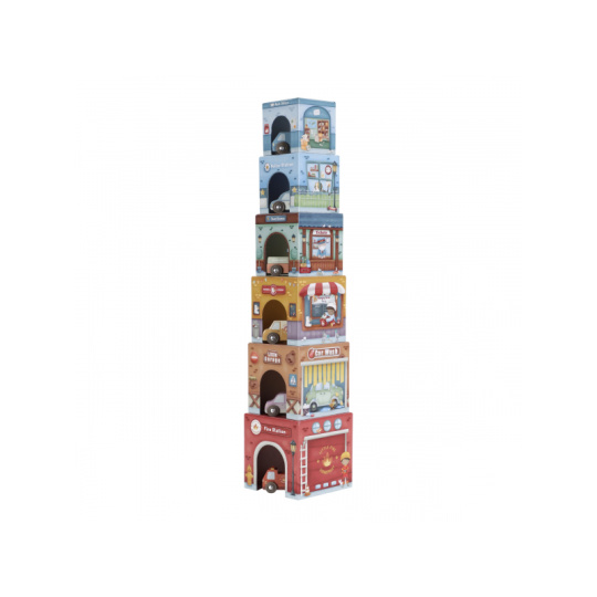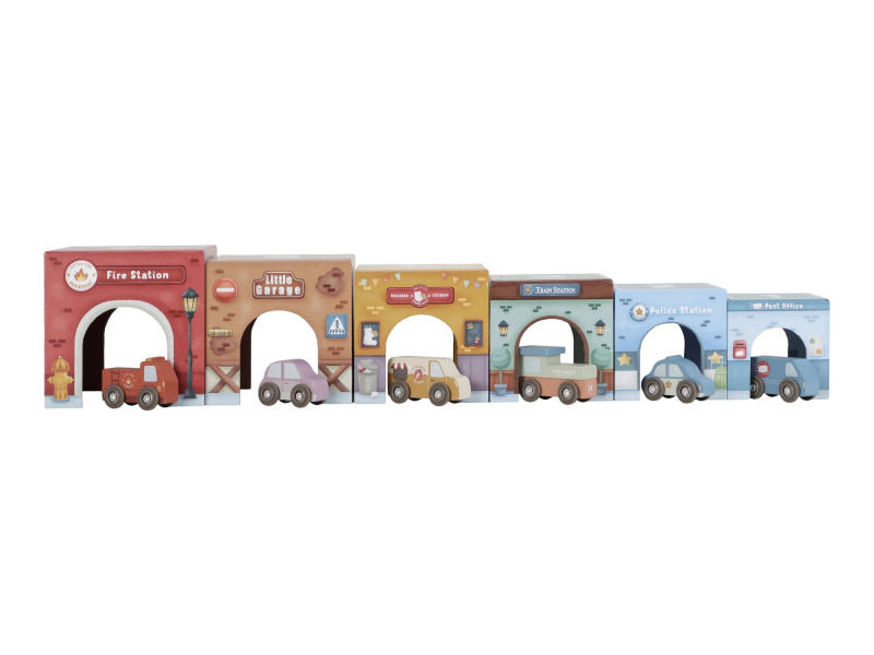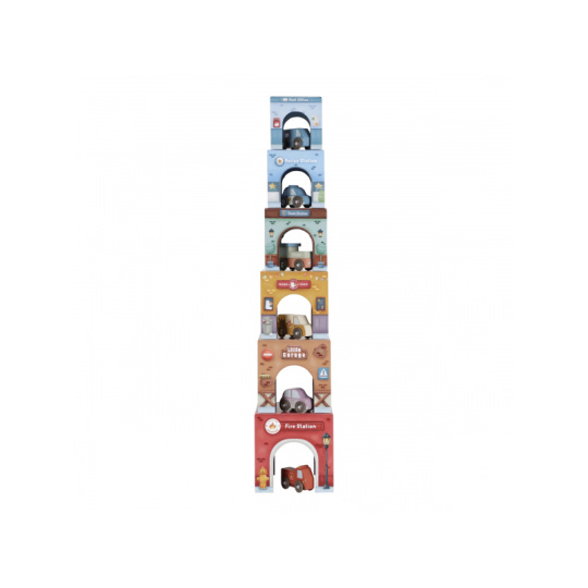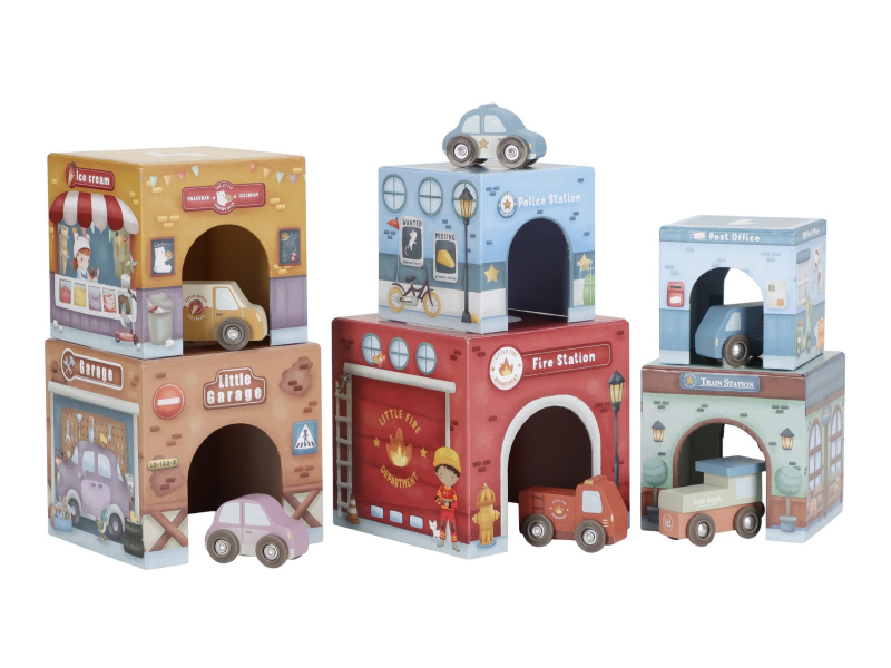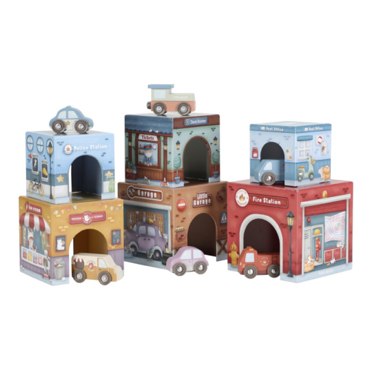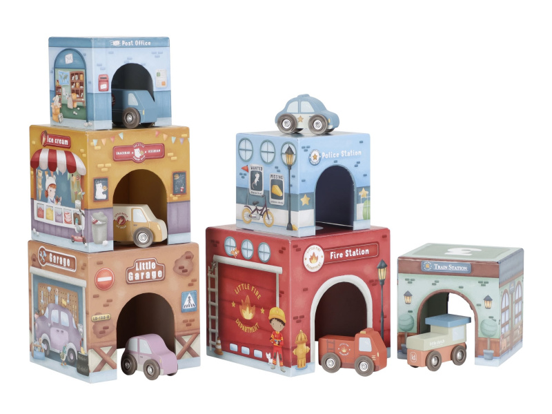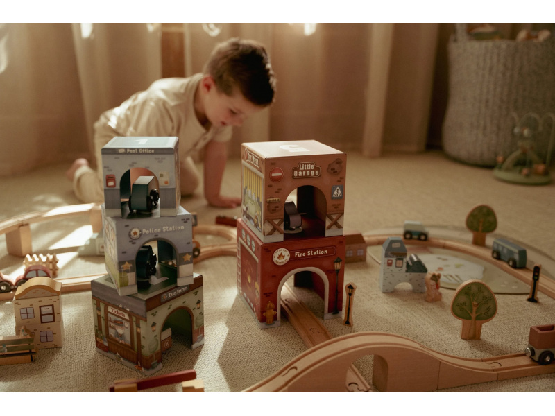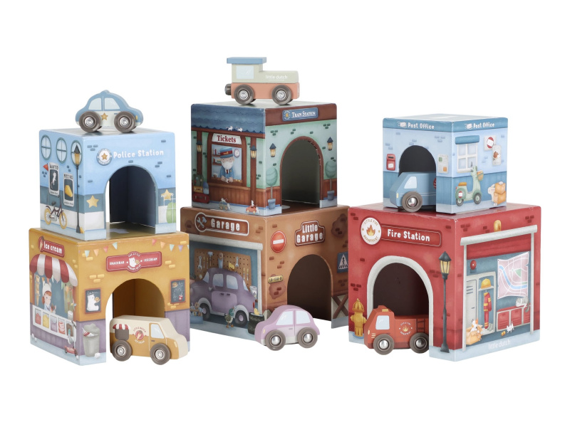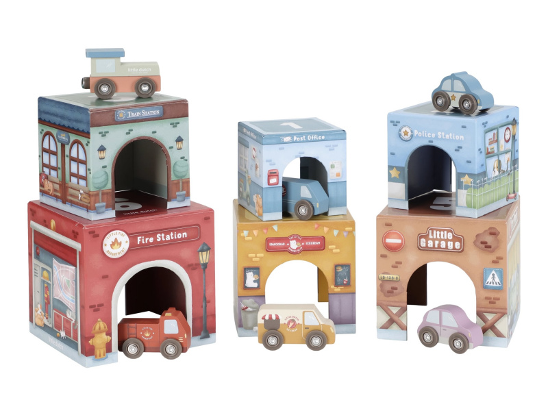 Stavět, objevovat a hrát si! Tato nápaditá sada Little Duch obsahuje šest ilustrovaných kartonových kostek různých velikostí, které představují budovy jako požární stanici, garáž nebo poštu – a k nim 6 dřevěných vozidel, patřících k jednotlivým budovám. Děti mohou kostky stavět na sebe do vysoké věže i rozkládat je po podlaze a vytvářet celé městečko. Kostky lze skvěle kombinovat i s vláčkodráhou Little Dutch, kde vláček i autíčka pohodlně projedou pod kostkami jako pod mosty. Každá kostka má jinou ilustraci, která podporuje rozvoj fantazie, a každé vozidlo má své vlastní parkovací místo. Originální sada nabízí nekonečné možnosti her a příběhů – od záchranných misí po výlety do města – a podporuje rozvoj logického myšlení, kreativity i motoriky dítěte. Sadu tvoří 6 kartonových kostek a 6 dřevěných vozidel. Vyrobeno z odolného FSC certifikovaného dřeva a pevného kartonu. Rozměry největší kostky: 14 × 14 × 14 cm Vhodné pro děti od 18 měsíců.