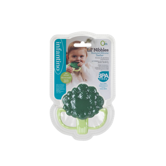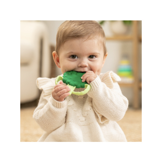 Rozkošné kousátko v podobě usměvavé brokolice je vyrobeno z pružného měkkého silikonu. Různorodé textury lákají dítě ke zkoumání v ústech, masírováním dásní kousátko pomáhá dítěti při prořezávání prvních zoubků. Tvar kousátka umožňuje snadné držení malými dětskými ručičkami. Rozměry: 92 x 92 mm Neobsahuje BPA. Vhodné pro děti od narození.