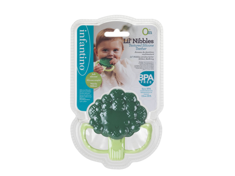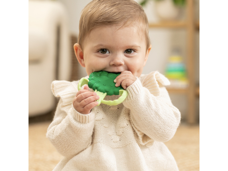 Rozkošné kousátko v podobě usměvavé brokolice je vyrobeno z pružného měkkého silikonu. Různorodé textury lákají dítě ke zkoumání v ústech, masírováním dásní kousátko pomáhá dítěti při prořezávání prvních zoubků. Tvar kousátka umožňuje snadné držení malými dětskými ručičkami. Rozměry: 92 x 92 mm Neobsahuje BPA. Vhodné pro děti od narození.