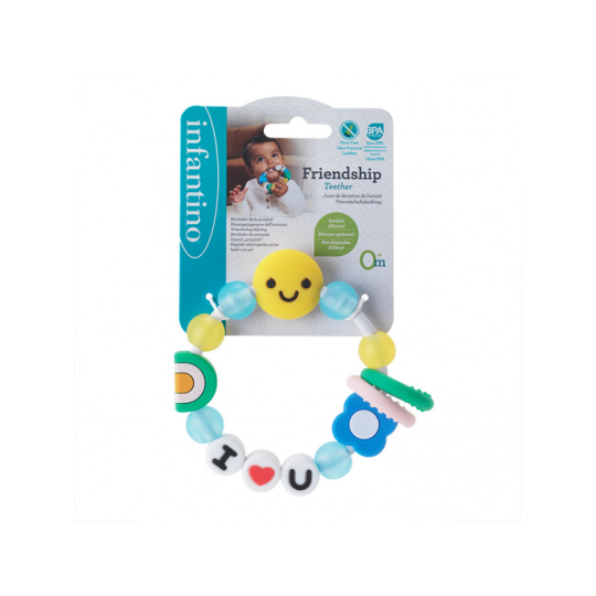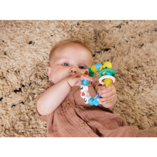 Krásné kousátko v podobě náramku je vyrobeno z pružného měkkého silikonu. Různorodé textury lákají dítě ke zkoumání v ústech, masírováním dásní kousátko pomáhá dítěti při prořezávání prvních zoubků. Tvar kousátka umožňuje snadné držení malými dětskými ručičkami. Rozměry: průměr 11 cm Neobsahuje BPA. Vhodné pro děti od narození.