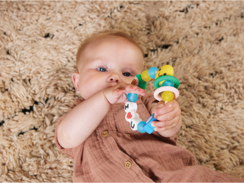 Krásné kousátko v podobě náramku je vyrobeno z pružného měkkého silikonu. Různorodé textury lákají dítě ke zkoumání v ústech, masírováním dásní kousátko pomáhá dítěti při prořezávání prvních zoubků. Tvar kousátka umožňuje snadné držení malými dětskými ručičkami. Rozměry: průměr 11 cm Neobsahuje BPA. Vhodné pro děti od narození.