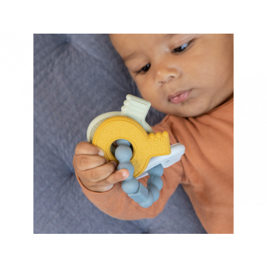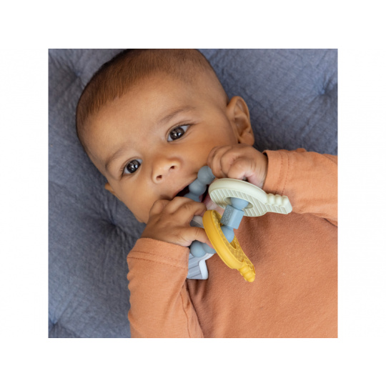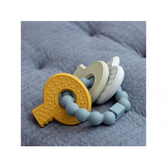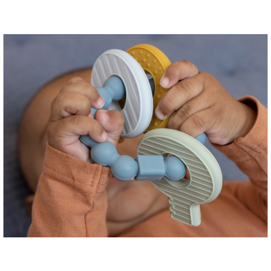 Měkké silikonové kousátko s různými texturami láká dítě ke zkoumání v ústech a pomáhá tak při prořezávání prvních zoubků. Kousátko v podobě klíčů na kroužku má tvar pro snadné uchopení dětskými ručičkami. Vhodné pro děti od 4 měsíců.