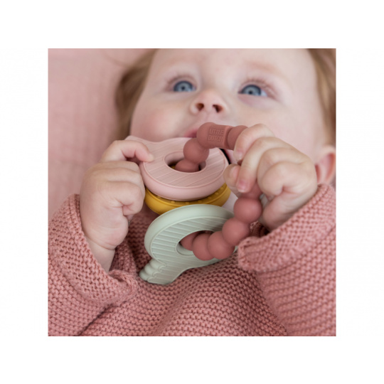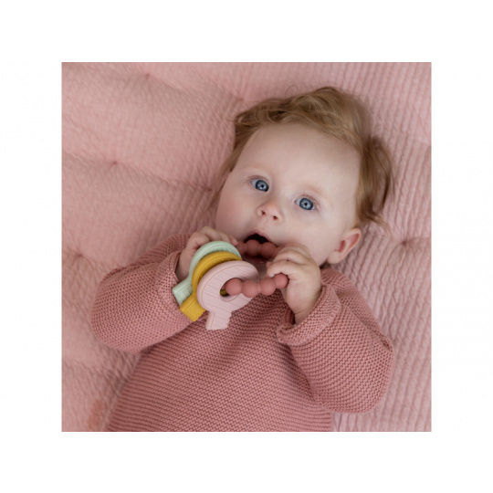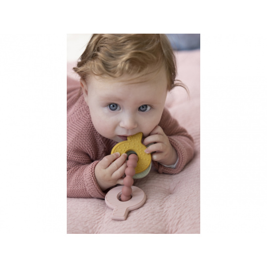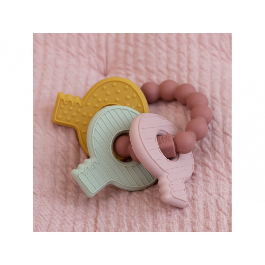 Měkké silikonové kousátko s různými texturami láká dítě ke zkoumání v ústech a pomáhá tak při prořezávání prvních zoubků. Kousátko v podobě klíčů na kroužku má tvar pro snadné uchopení dětskými ručičkami. Vhodné pro děti od 4 měsíců.