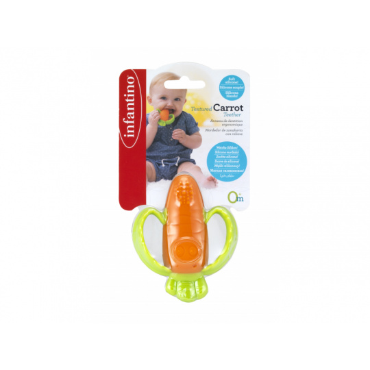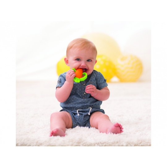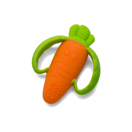 Rozkošné kousátko v podobě usměvavé mrkvičky je vyrobeno z pružného měkkého silikonu. Různorodé textury lákají dítě ke zkoumání v ústech, masírováním dásní kousátko pomáhá dítěti při prořezávání prvních zoubků. Tvar kousátka umožňuje snadné držení malými dětskými ručičkami. Neobsahuje BPA. Vhodné pro děti od narození.