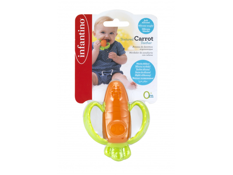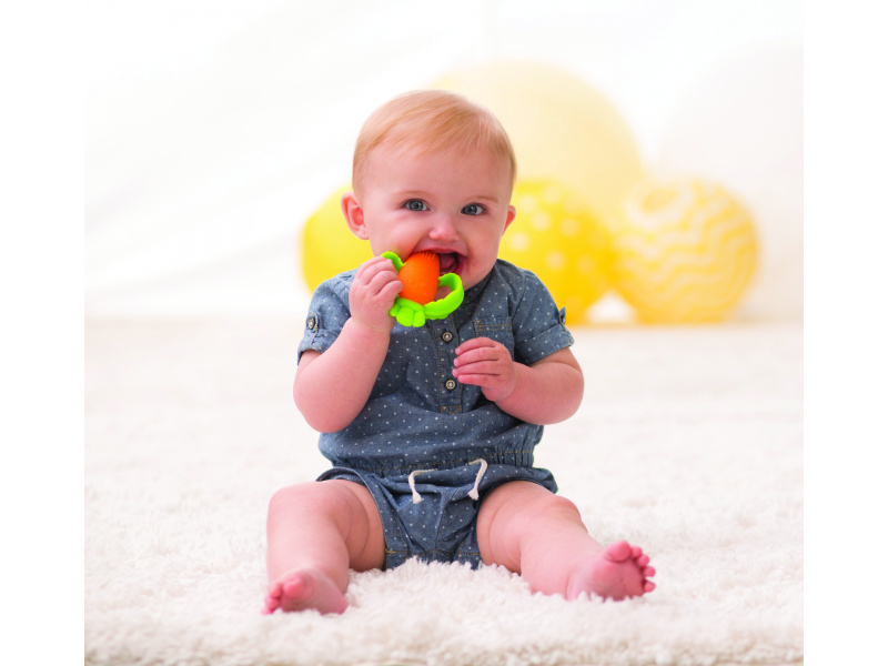 Rozkošné kousátko v podobě usměvavé mrkvičky je vyrobeno z pružného měkkého silikonu. Různorodé textury lákají dítě ke zkoumání v ústech, masírováním dásní kousátko pomáhá dítěti při prořezávání prvních zoubků. Tvar kousátka umožňuje snadné držení malými dětskými ručičkami. Neobsahuje BPA. Vhodné pro děti od narození.