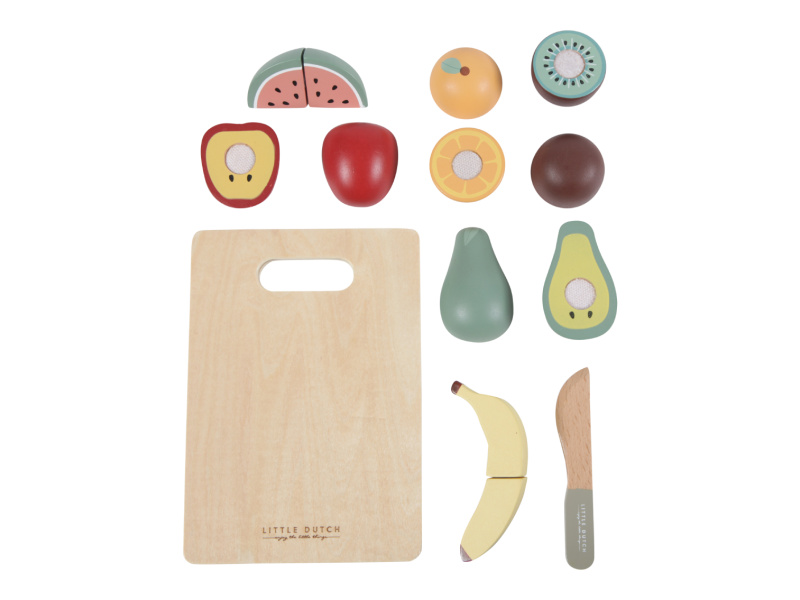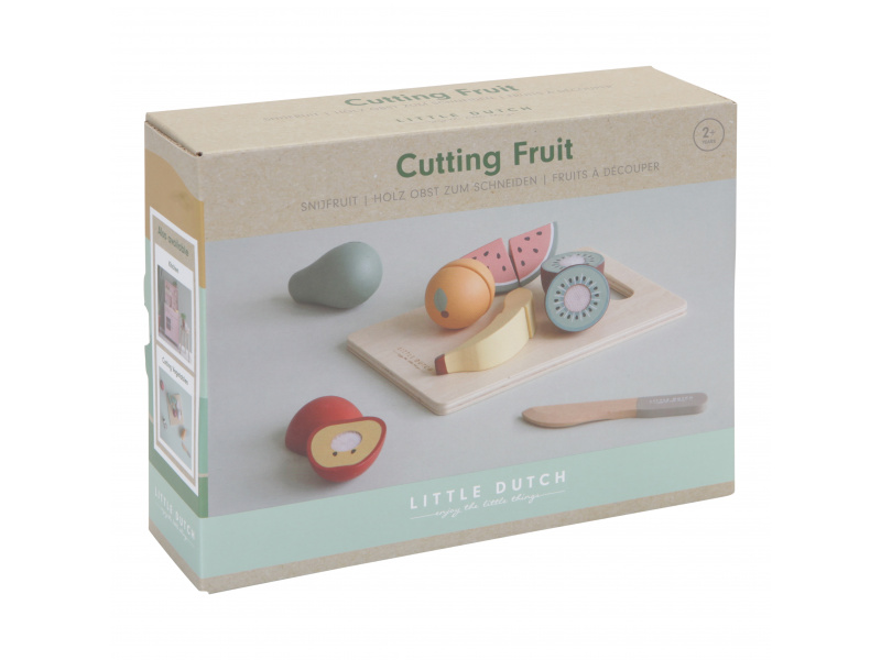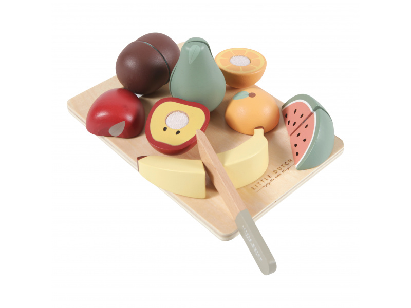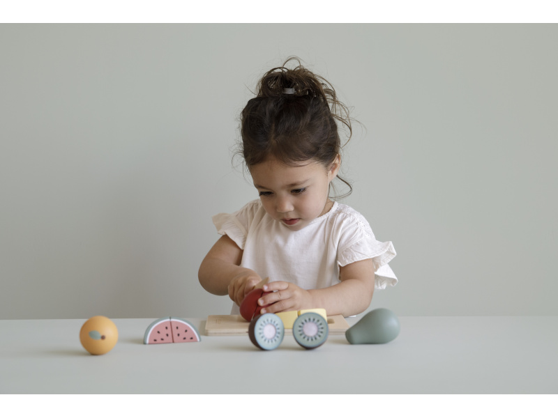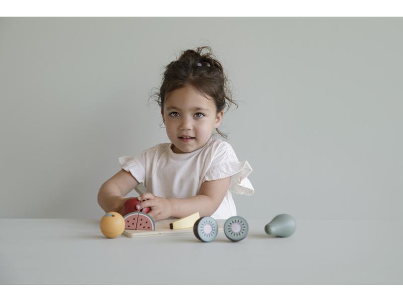 Ovoce je potřeba před servírováním nakrájet! Tato dřevěná sada obsahuje 6 druhů ovoce (jablko, banán, kiwi, hrušku, pomeranč a meloun), dřevěný nožík a krájecí prkénko. Každý kousek zeleniny je možné rozdělit na dva kusy a opět spojit pomocí suchého zipu. Rozměry: 21 x 16,7 x 6 cm Vhodné pro děti od 2 let.