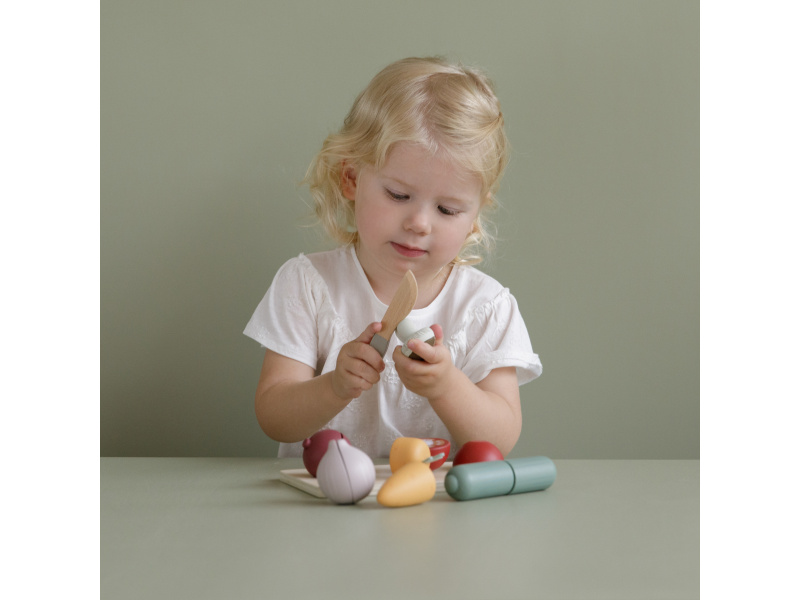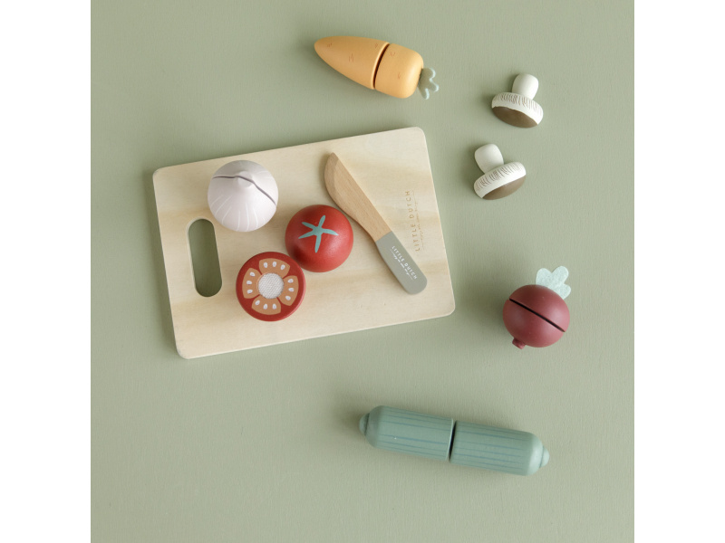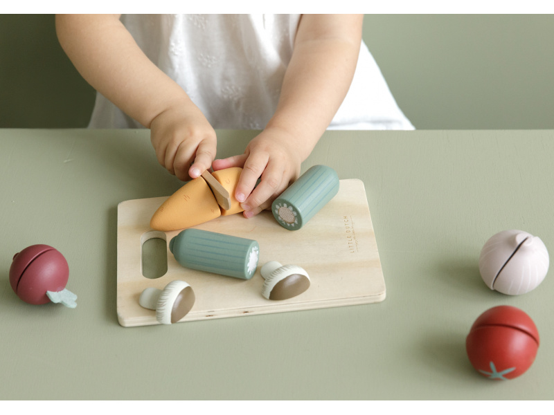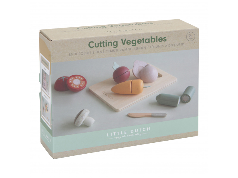 Zeleninu je potřeba před vařením nakrájet, to ví každý malý kuchař i kuchařka. Tato dřevěná sada obsahuje 6 druhů zeleniny (mrkev, okurku, hříbek, rajče, cibuli a červenou řepu), dřevěný nožík a krájecí prkénko. Každý kousek zeleniny je možné rozdělit na dva kusy a opět spojit pomocí suchého zipu. Rozměry: 21 x 16,7 x 6 cm Vhodné pro děti od 2 let.