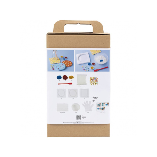 Skvělá zábava pro děti i rodiče! Tato sada umožní dětem od 5 let vytvořit si barevné podložky z cementu, které si samy namíchají, odlijí a ozdobí. Ideální projekt pro první seznámení s odléváním a tvoření s barvami. Tvoř, míchej a dekoruj: • Děti si vytvoří 3 barevné podložky v modré, červené a žluté barvě • Do čerstvého cementu mohou vmáčknout figurkové korálky – zvířátka, květiny nebo smajlíky • Výsledkem jsou originální dekorace nebo ručně vyrobené dárky Snadné a zábavné tvoření: • Stačí smíchat cement, vodu a barvu, promíchat, nalít do formy a ozdobit • Sada je vhodná i pro menší děti (od 5 let) – pod dohledem dospělého • Pomáhá rozvíjet kreativitu, jemnou motoriku i trpělivost Obsah balení: Bílý cement Pigmenty (červená, modrá, žlutá) Míchací špachtle Formy na odlévání Figurkové korálky Rukavice Návod Vhodné pro děti od 5 let.