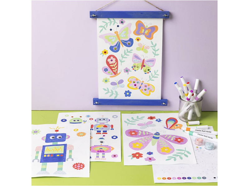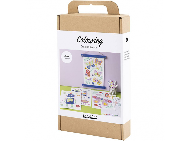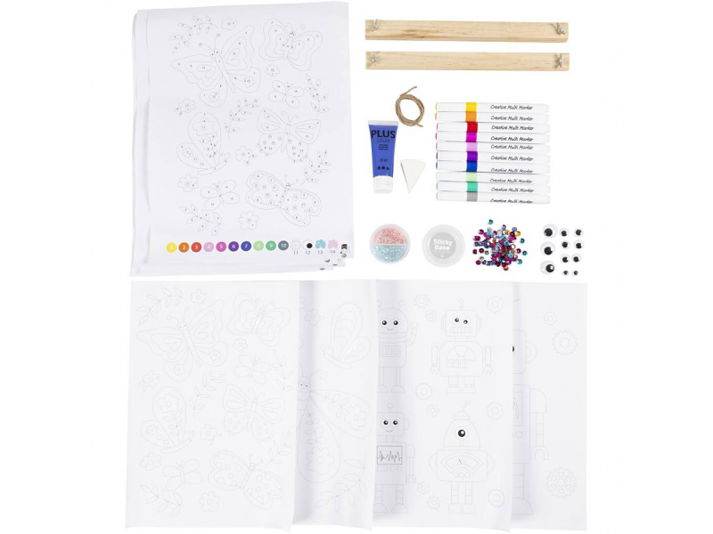 Objevte radost z tvoření a barev s touto originální sadou, která dětem od 6 let umožní vytvořit 4 krásné obrázky podle čísel. Kombinuje kresbu fixami, malbu a dekoraci s třpytivými prvky – a každý výtvor se stane osobním uměleckým dílem. Maluj, čísli a zdob: • Děti vybarvují motivy podle čísel – snadno a s jistotou, že výsledek bude vždy krásný • Na výběr jsou motivy jako motýli nebo roboti – pro každou náladu • Pomocí třpytivé modelíny, flitrů a pohyblivých očí dodají výtvorům zábavný 3D efekt Vlastní galerie na zdi: • Po dokončení si děti mohou obrázky zarámovat pomocí dřevěných lišt na zavěšení, které si samy nabarví • Hotová díla se stanou dekorací dětského pokoje nebo milým dárkem Zábava i rozvoj v jednom: • Podporuje soustředění, trpělivost a porozumění barvám a číslům • Děti zažijí radost z dokončeného obrázku a získají chuť tvořit dál Obsah balení: 4 potištěná malířská plátna Sada barevných fixů Třpytivá modelína Flitry Samolepicí očička Akrylová barva a štětec Lepidlo Dřevěné závěsy Návod s číselnou předlohou Vhodné pro děti od 6 let.