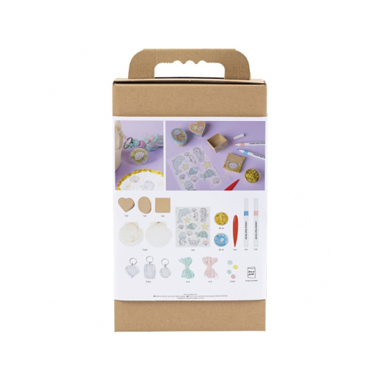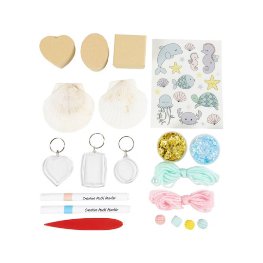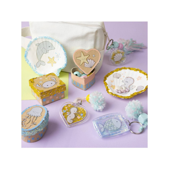Kreativní sada s mořskou tematikou, která dětem umožní vytvářet vlastní třpytivé poklady zdobené motivy z hlubin oceánu. Ideální pro malé umělce, kteří milují barvy, tvoření a mořské motivy plné fantazie. Mořské poklady plné barev a třpytu: • Děti si mohou vyrobit dvě ozdobné mušle, tři mini krabičky a tři přívěsky na klíče • Kombinují třpytivou modelovací hmotu, samolepky, fixy a další materiály podle své fantazie • Hotové výrobky poslouží jako originální dekorace, dárky nebo ozdoby na školní tašku či penál Tvoření, které rozvíjí: • Podporuje kreativitu, kombinování barev a jemnou motoriku • Učí děti trpělivosti a schopnosti dotáhnout nápad do konce • Nabízí prostor pro vlastní fantazii a sebevyjádření Obsah balení: Třpytivá modelovací hmota, mini krabičky, mušle, samolepky, modelovací nástroje, fixy, kroužky na klíče, akrylová příze a dřevěné korálky Vhodné pro děti od 5 let.