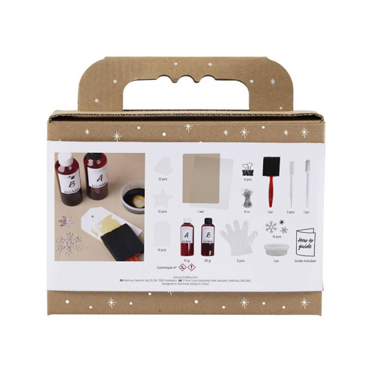 Elegantní kreativní sada pro dospělé, která přináší kouzlo výtvarné techniky kyanotypie přímo k vašemu vánočnímu balení dárků. Vytvořte si vlastní originální visačky v odstínech modré – jedinečné, stylové a osobní. Vánoční visačky s uměleckým dotekem: • Sada obsahuje vše potřebné k výrobě až 36 visaček pomocí techniky tisku na slunce • Stačí nanést směs cyanotypie na papír, položit motiv (např. větvičku, flitr nebo korálek) a nechat jej osvětlit slunečními paprsky • Po opláchnutí a usušení můžete doplnit visačky stříbrnými detaily, nápisy nebo závěsnou šňůrkou • Ideální k ozdobení dárků, ale i jako stylové dekorace na stromeček či přání Tvoření, které inspiruje: • Umožňuje vyzkoušet si výtvarnou techniku kyanotypie – snadno a bez zkušeností • Rozvíjí estetické cítění, přesnost a kreativitu • Spojuje relaxaci, umění a vánoční atmosféru do jednoho příjemného projektu Obsah balení: Složky cyanotypie A + B, papírové štítky, stříbrný fix, flitry, šňůrka, plastová fólie s podložkou, klipy, kovová dóza, pěnový štětec, pipeta a rukavice Vhodné pro začátečníky.