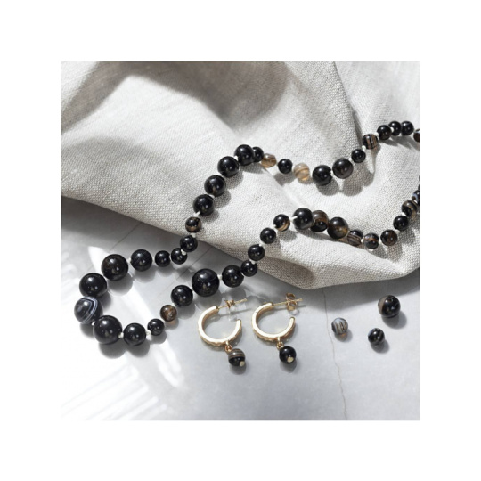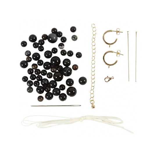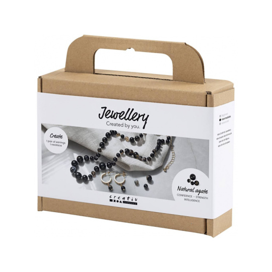 Ručně vyrobené šperky s hlubokým významem. Tato kreativní sada vám umožní vytvořit náhrdelník a pár náušnic s přírodními korálky z achátu – polodrahokamu známého svým mystickým vrstveným vzhledem a posilující energií. Silný výraz, jemné detaily: • Každý korálek z achátu je jedinečný – s černým základem a jemnými bílými pruhy • Achát symbolizuje vnitřní sílu, rovnováhu, sebedůvěru a klid • Kombinace velkých a malých korálků spolu s vázáním uzlů mezi nimi vytváří nadčasový organický vzhled Šperky, které mají hloubku i styl: • Vytvoříte 1 náhrdelník a 1 pár náušnic • Elegantní detaily dodávají šperkům profesionální vzhled • Vhodné pro tvořivé duše se zájmem o šperky s příběhem a osobitým stylem Co budete potřebovat navíc: • Kleště nejsou součástí balení – doporučujeme: ploché, kulaté a boční štípací Obsah balení: Přírodní korálky z achátu Bavlněná šňůrka Kovové kruhy Karabinka Řetízek Špendlík Návod