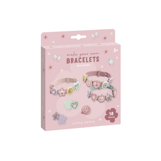 18-dílná sada umožní vaší parádnici vyrobit si 3 náramky, které je možné s pomocí nasazovacích přívěsků měnit a vytvářete tak pokaždé nové varianty náramku. Pásek náramku umožňuje přizpůsobit velikost ruce dítěte. Sada je součástí designové kolekce hraček a doplňků Little Dutch Fairy Garden inspirované životem na zahradě. Vhodné pro děti od 3 let.