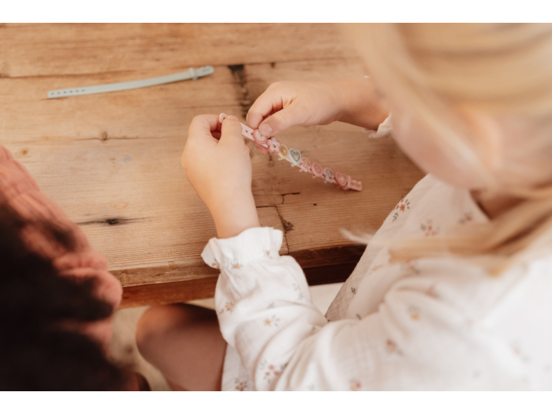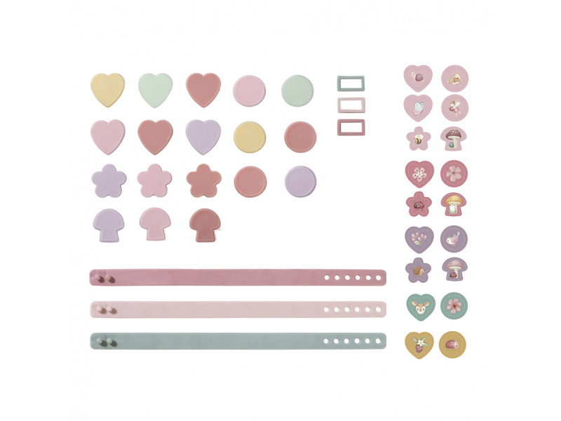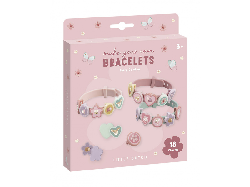 18-dílná sada umožní vaší parádnici vyrobit si 3 náramky, které je možné s pomocí nasazovacích přívěsků měnit a vytvářete tak pokaždé nové varianty náramku. Pásek náramku umožňuje přizpůsobit velikost ruce dítěte. Sada je součástí designové kolekce hraček a doplňků Little Dutch Fairy Garden inspirované životem na zahradě. Vhodné pro děti od 3 let.