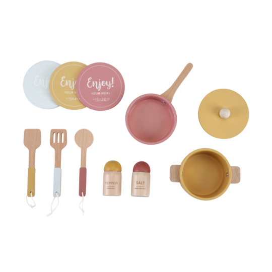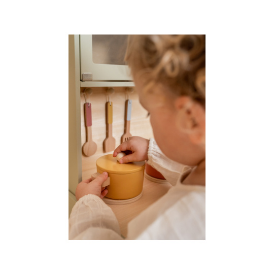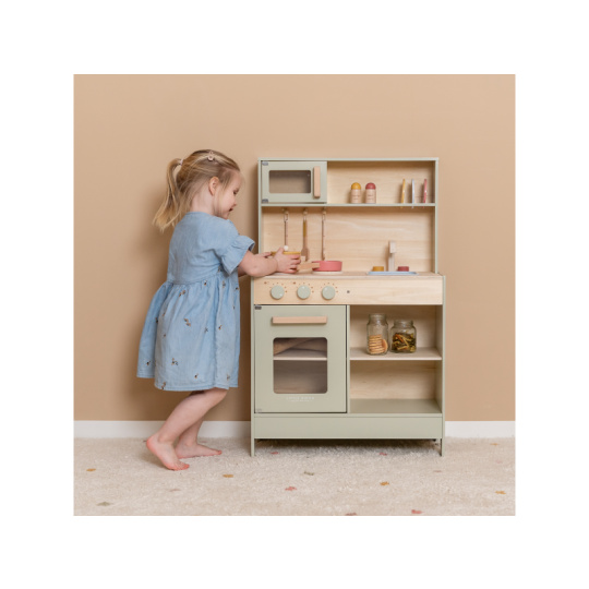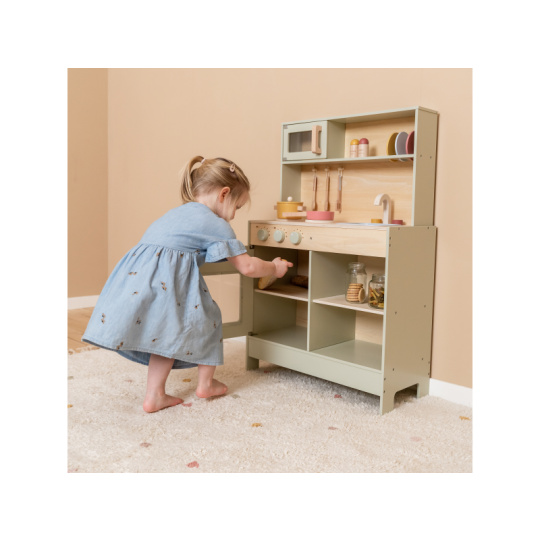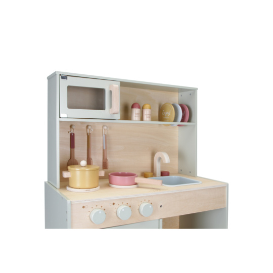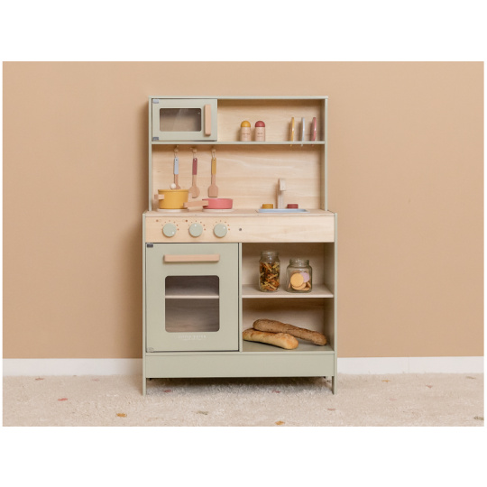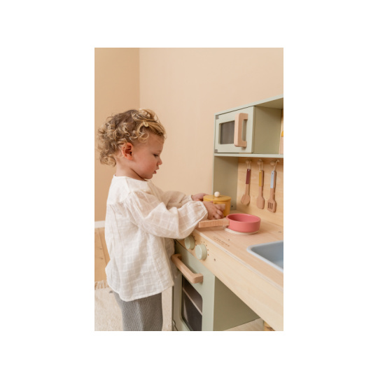 Krásná dřevěná kuchyňka nabízí vše, o čem malý kuchař či kuchařka sní, když vymýšlí nové recepty pro rodinu či své panenky a oblíbené plyšáky. S pánví, hrncem a dalším nádobím není problém připravit několik chodů najednou. Trouba upeče koláč, na sporáku se uvaří zelenina, mikrovlnka rychle ohřeje, co je potřeba. K dispozici je i sůl a pepř na dochucení. Po práci si kuchař umyje ruce v dřezu. Skříňka nabízí prostor pro uložení potravin. Děti se učí napodobováním svých rodičů a zároveň taková hra rozvíjí kreativitu, soustředění, jemnou motoriku a sociální dovednosti. Kuchyňku můžete doplnit dalšími dřevěnými hračkami Little Dutch, např. kávovarem, toustovačem, kuchyňskou váhou, krájecím ovocem, krájecí zeleninou, čajovým servisem apod. Rozměry: 91 x 58 x 28 cm Vhodné pro děti od 3 let.