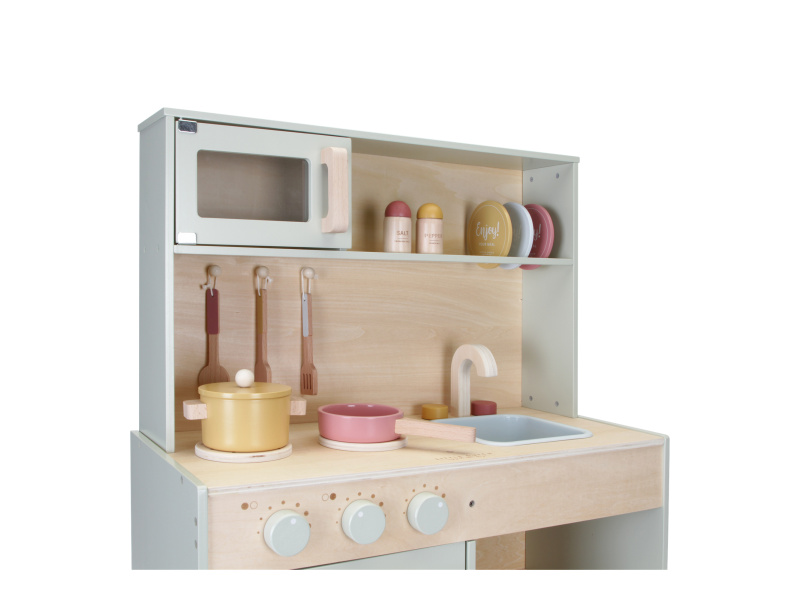 Krásná dřevěná kuchyňka nabízí vše, o čem malý kuchař či kuchařka sní, když vymýšlí nové recepty pro rodinu či své panenky a oblíbené plyšáky. S pánví, hrncem a dalším nádobím není problém připravit několik chodů najednou. Trouba upeče koláč, na sporáku se uvaří zelenina, mikrovlnka rychle ohřeje, co je potřeba. K dispozici je i sůl a pepř na dochucení. Po práci si kuchař umyje ruce v dřezu. Skříňka nabízí prostor pro uložení potravin. Děti se učí napodobováním svých rodičů a zároveň taková hra rozvíjí kreativitu, soustředění, jemnou motoriku a sociální dovednosti. Kuchyňku můžete doplnit dalšími dřevěnými hračkami Little Dutch, např. kávovarem, toustovačem, kuchyňskou váhou, krájecím ovocem, krájecí zeleninou, čajovým servisem apod. Rozměry: 91 x 58 x 28 cm Vhodné pro děti od 3 let.