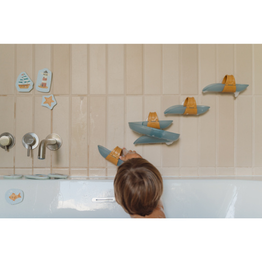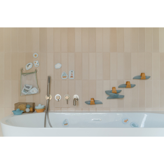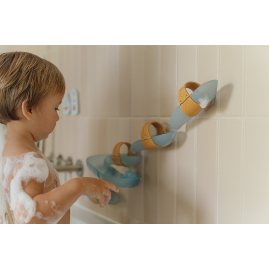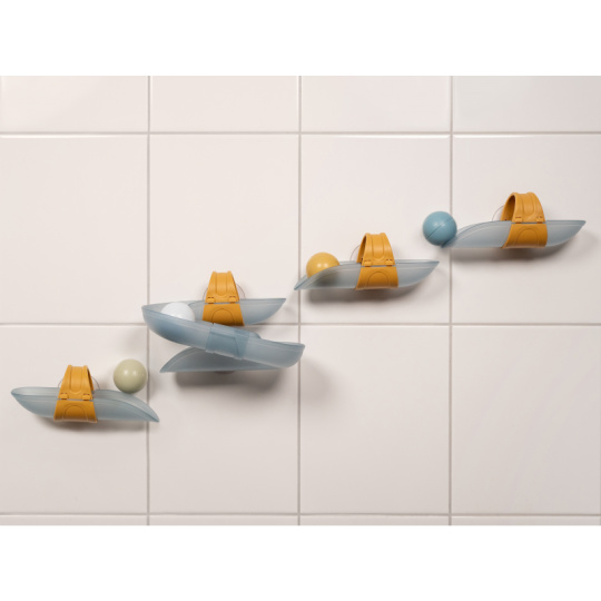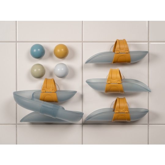Koupání bude ještě zábavnější s touto speciální kuličkovou dráhou do vany. Dráhu snadno připevníte na vanu či dlaždičky s pomocí přísavek, které umožňují i její snadné sundání po koupeli. Sledujte společně s vaším dítětem, jak se míčky kutálí dolů jeden za druhým, až na konci žbluňknou do vody. Hračka pomáhá rozvíjet koordinaci ruka - oko dítěte a učí jej zábavným způsobem konceptu příčiny a následku. Sada obsahuje 4 díly dráhy a 4 míčky. Materiál: PP / ABS Vhodné pro děti od 10 měsíců.