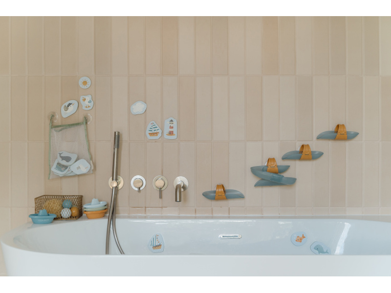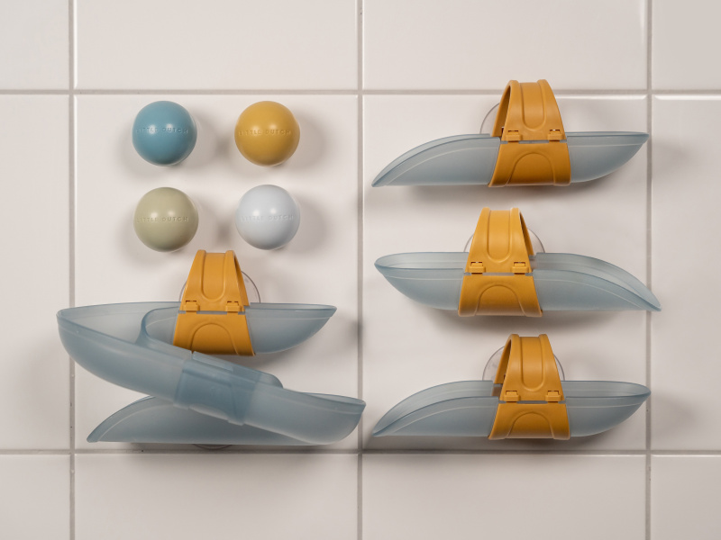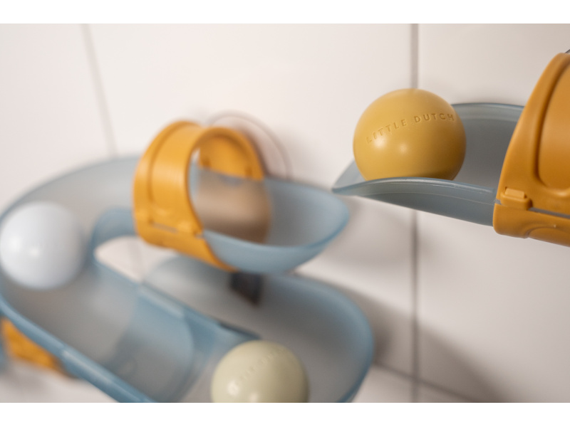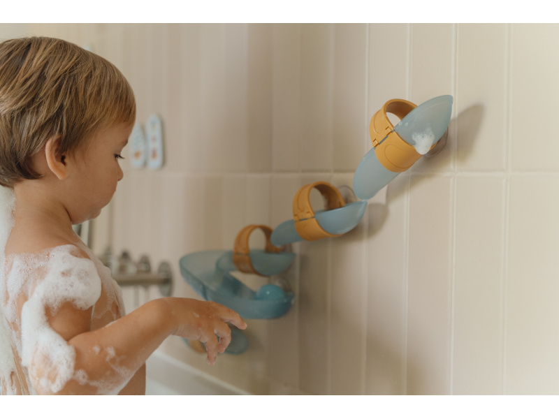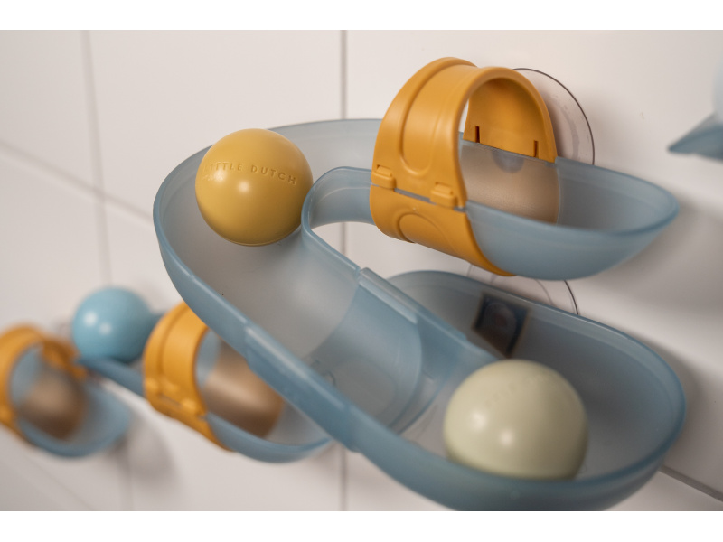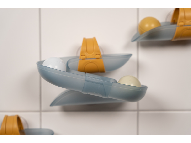Koupání bude ještě zábavnější s touto speciální kuličkovou dráhou do vany. Dráhu snadno připevníte na vanu či dlaždičky s pomocí přísavek, které umožňují i její snadné sundání po koupeli. Sledujte společně s vaším dítětem, jak se míčky kutálí dolů jeden za druhým, až na konci žbluňknou do vody. Hračka pomáhá rozvíjet koordinaci ruka - oko dítěte a učí jej zábavným způsobem konceptu příčiny a následku. Sada obsahuje 4 díly dráhy a 4 míčky. Materiál: PP / ABS Vhodné pro děti od 10 měsíců.