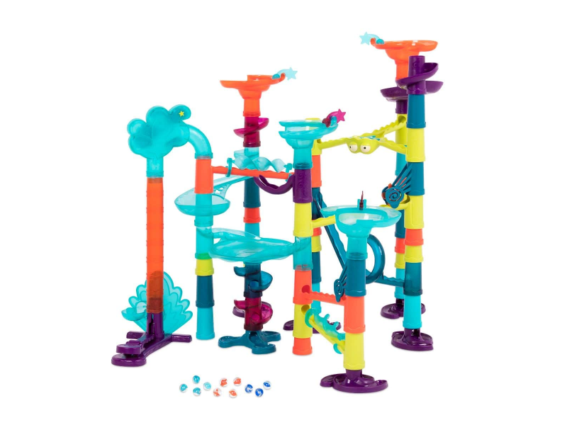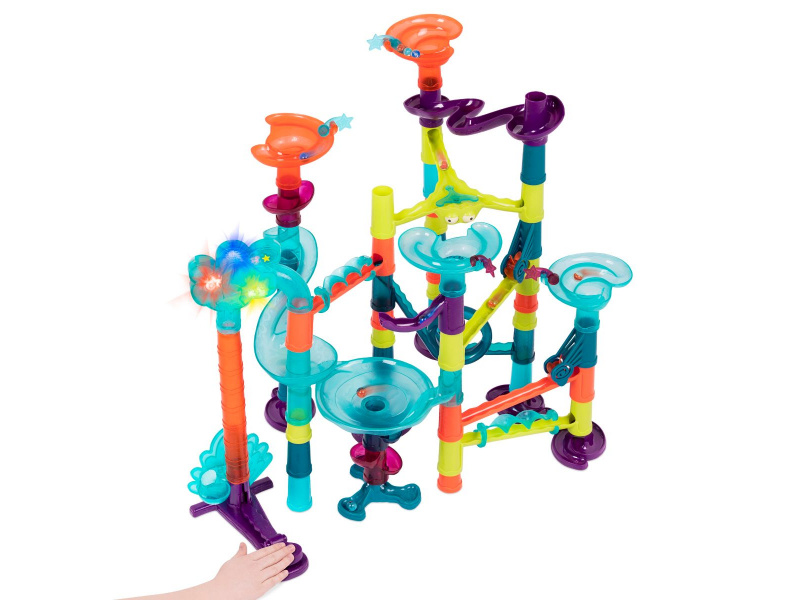 Maxi kuličková dráha nabízí nekonečnou variabilitu při stavění dráhy z barevných, odolných dílů. Postavte spolu s vašimi dětmi dráhu obsahující vysoké věže, kroutící se mosty i různorodé pohyblivé části a pak si užijte sledování pohybu kuliček celým bludištěm. Pro ještě větší efekt dráha obsahuje i díl s barevnými světýlky. Hračka pomáhá rozvíjet kreativní myšlení i motorické dovednosti dítěte. Zároveň učí dítě chápat princip příčiny a následku. Sada obsahuje 51 dílů dráhy a 11 kuliček. Vyměnitelné baterie 3 x AG13 jsou součástí balení. Vhodné pro děti od 4 let.