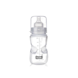 Polypropylenová láhev o objemu 250 ml se speciálně konstruovaným víčkem, které umožňuje bezpečně sterilizovat láhev a všechny její části za pouhou 1,5 min. Obsahuje efektivní systém odvzdušňování SUPER vent, který zabraňuje vzniku podtlaku a minimalizuje vznik dětské koliky. Neobsahuje BPA. **Láhev obsahuje dynamický silikonový dudlík Lovi**, který při krmení modifikuje svůj tvar (prodlužuje se). Povzbuzuje dítě k aktivní činnosti během sání, stejně jako u kojení, stimuluje místa, která se podílí na rozvoji mluvy a pozitivně ovlivňuje správný vývoj celé dutiny ústní.
