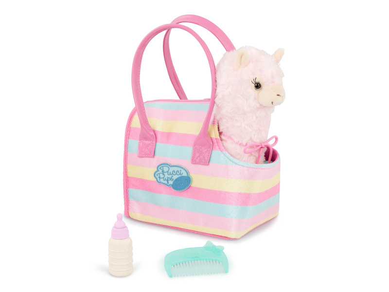 Něžná plyšová lama v kabelce s krásným potiskem je vždy připravena na mazlení i na procházku. Miluje vyčesávání své hebké srsti hřebínkem a díky kabelce si ji vaše dítě může vzít kamkoli. Kabelka má otvor, aby lama při přenášení viděla na svět. Obsah balení: kabelka, plyšová lama, hřeben, lahvička Rozměry: cca 25 x 13 x 24 cm Vhodné pro děti od 3 let.