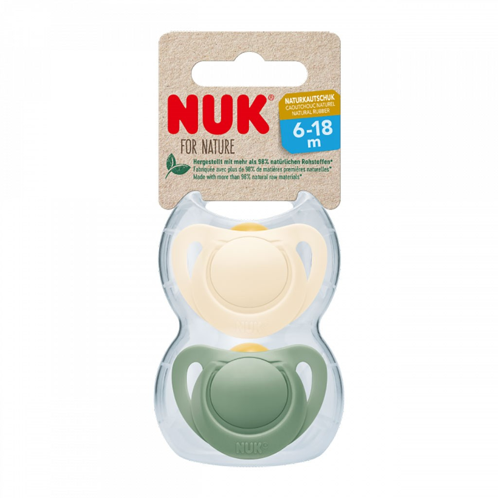 Kojenecké šidítko z přírodního kaučuku NUK For Nature 2/box 6-18 měsíců. Tyto dudlíky NUK jsou vyrobeny z přírodního kaučukového latexu a kompletně vyrobeny v Německu. Samozřejmostí je, že neobsahují BPA a jsou v souladu evropskou bezpečnostní normou EN1400. NUK for Nature tvoří přírodní suroviny minimálně 98 %. Pevné části vyrábíme z udržitelných plastů. Přírodní původ je nezávisle certifikován. Měkký náustek je vyroben z čistého přírodního kaučuku. Obnovitelná surovina 100% rostlinného původu je velmi měkká, teplá a mimořádně pružná. Originální tvar NUK je také inspirován přírodou - nahoře zakulacený, dole plochý. Dudlík NUK for Nature se proto snadno přitiskne k podnebí a nechá dostatek místa pro jazyk. Bez BPA, 2 kusy v balení, baleno pouze v papíře - obal lze vyhodit do tříděného odpadu. Latexové dudlíky by se měly měnit každé 1-2 měsíce, nebo nejpozději, když začnou lepit.