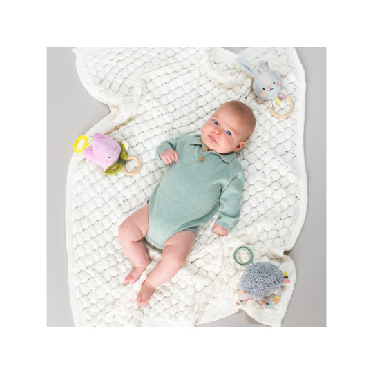 Chrastítko tvoří měkká plyšová hračka v podobě střapatého ježka Spikeho a průhledný plastový kroužek naplněný barevnými korálky. Různé tvary a povrchy hračky podněcují dítě ke zkoumání rukama i ústy a pomáhají rozvíjet jemnou motoriku a smysly dítěte. Vhodné pro děti od narození.