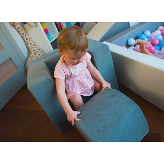 Sedačka se velmi rychle stane oblíbeným místem vašeho dítěte k odpočinku nebo hraní. A díky svému všestrannému a elegantnímu stylu se snadno vejde do interiéru každé místnosti. Skládá se ze dvou částí. Z kostky a křesílka, které má vyklápěcí opěrku rukou. Po sklopení opěrky rukou, stačí už jen do středu doplnit kostku a z křesílka je sedačka-lenoška.