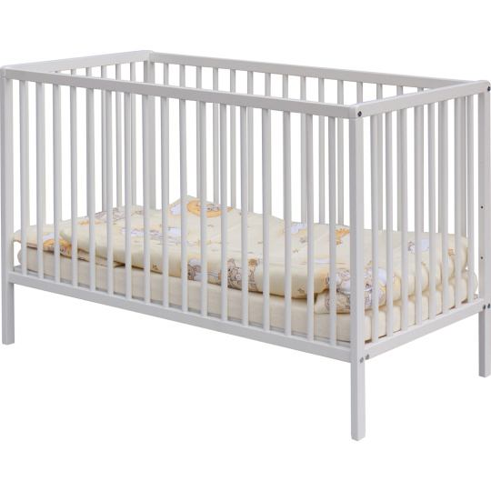 1 . Dětská dřevěná postýlka 120x60 cm - bílá, masiv, vyndavací příčky, 3 polohy roštu, nohy postýlky jsou předvrtané pro možné nasazení koleček
