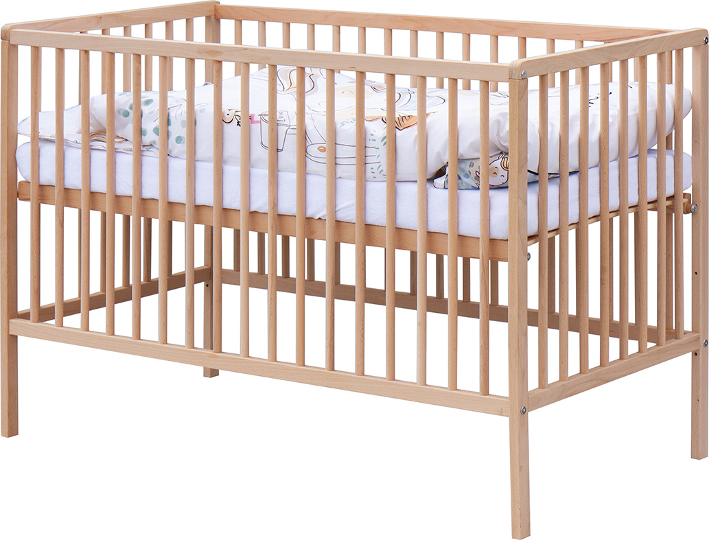 1 . Dětská dřevěná postýlka 120x60 cm - přírodní ECO, masiv, vyndavací příčky, 3 polohy roštu, nohy postýlky jsou předvrtané pro možné nasazení koleček