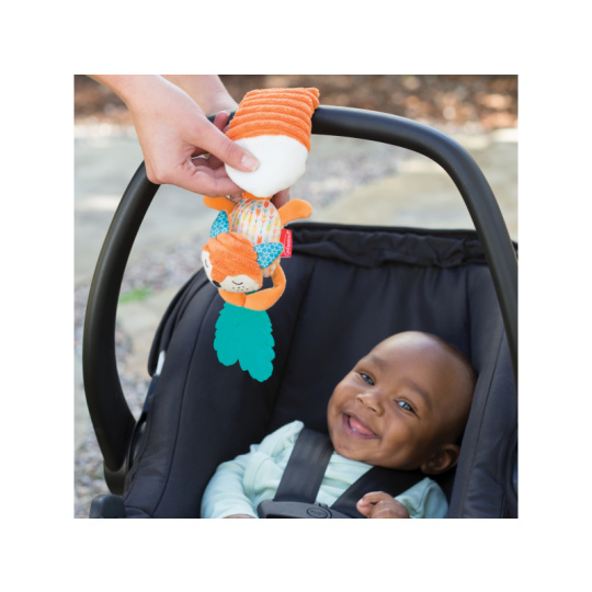 Plyšová hračka v podobě roztomilého lišáka zabaví vaše dítě na cestách v kočárku či autosedačce. Zatáhněte za kousátko a sledujte spolu s dítětem, jak lišák vibruje! Pozornost dítěte upoutají i výrazné barvy a různorodé textury ke zkoumání. Hračku snadno připevníte s pomocí suchého zipu na autosedačku či kočárek. Vhodné pro děti od narození.