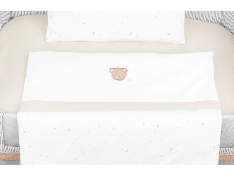 Kompletní ložní sada do malé postýlky nebo kolébky obsahuje polštářek, peřinku, povlečení na polštářek a peřinku a natahovací prostěradlo. Povlečení je vyrobeno z jemné, prémiové 100% bavlny s Oeko-Tex® certifikací. Rozměry: peřinka a potah na peřinku: 55 x 85 cm, polštářek a potah na polštářek: 35 x 45 cm, natahovací prostěradlo: 50 x 80 cm Složení: 100% bavlna, výplň 100% polyester. Vhodné pro děti od narození do malých dětských postýlek a kolébek s matrací rozměru 50x85cm.