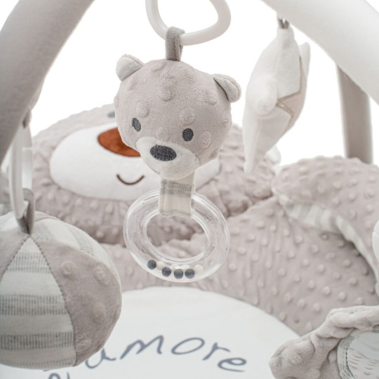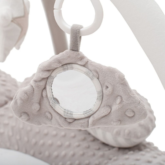 Podložka má hrazdičku s odnímatelnými hračkami, které lze libovolně přemísťovat nebo používat samostatně. Každé miminko si najde něco zajímavého – zrcátko, šustící prvky, pískátko, měkké kousátko, zvoneček i hračku s vestavěným přehrávačem, která po stisknutí přehraje příjemnou melodii.
