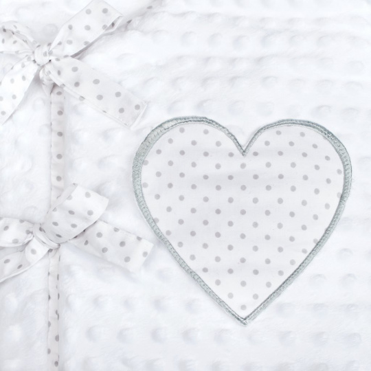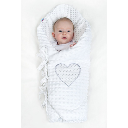 Luxusní šněrovací zavinovačka z Minky New Baby. Zavinovačka je vyrobena ze dvou typů tkanin a je zdobena krásným vyšívaným srdíčkem a šedým puntíkovaným bavlněným podkladem. První je velmi měkká a na dotek příjemná, hebká Minky látka s výstupky pro stimulaci senzomotoriky a druhou je 100% bavlna. Zavinovačka se zavazuje na tři řady stuh, které Vaše miminko pevně zavinou.