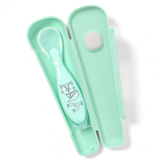 Silikonová lžíčka s přísavkou v pouzdře je ideální na doma, na procházku nebo na cesty. Má vhodný tvar a je ideální k tomu, aby se vaše dítě naučilo jíst samostatně. Vyrobeno z vysoce kvalitního silikonu určeného pro styk s potravinami.