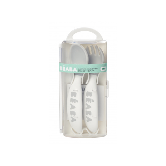 Plastová lžička a vidlička pro první samostatné krmení má ideální tvar pro dětská ústa. Tvar držadla usnadňuje dítěti držení lžičky i vidličky a je vhodný pro praváky i leváky. Praktické pouzdro umožňuje hygienické přenášení lžičky a vidličky např. v přebalovací tašce. Možno mýt v myčce. Neobsahuje BPA. Vhodné pro děti od 8 měsíců.