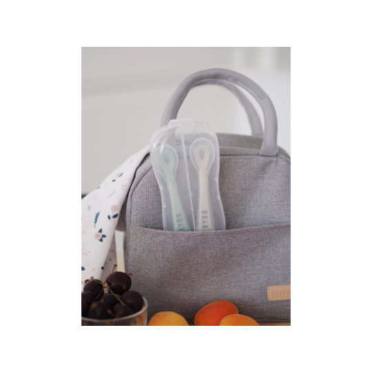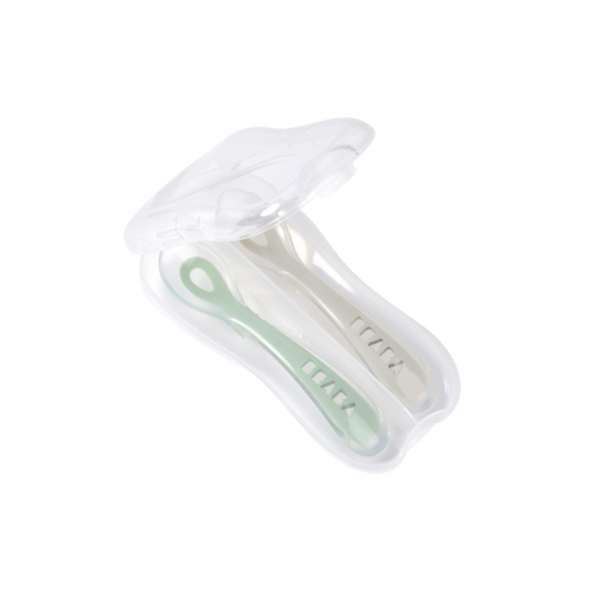 Silikonová lžička pro první samostatné krmení má ideální tvar pro dětská ústa. Tvar držadla usnadňuje dítěti držení lžičky. Praktické pouzdro umožňuje hygienické přenášení lžiček např. v přebalovací tašce. Možno mýt v myčce. Neobsahuje BPA. Vhodné pro děti od 8 měsíců.