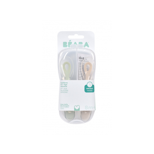 Silikonová lžička pro první samostatné krmení má ideální tvar pro dětská ústa. Tvar držadla usnadňuje dítěti držení lžičky. Integrovaná opěrka lžičky zabraňuje při položení lžičky na stůl kontaktu jídla se stolem a zajišťuje tak čistotu a hygienu. Praktické pouzdro umožňuje hygienické přenášení lžiček např. v přebalovací tašce. Lžičky jsou vyrobeny z vysoce kvalitního potravinářského silikonu. Možno mýt v myčce. Vhodné pro děti od 8 měsíců.