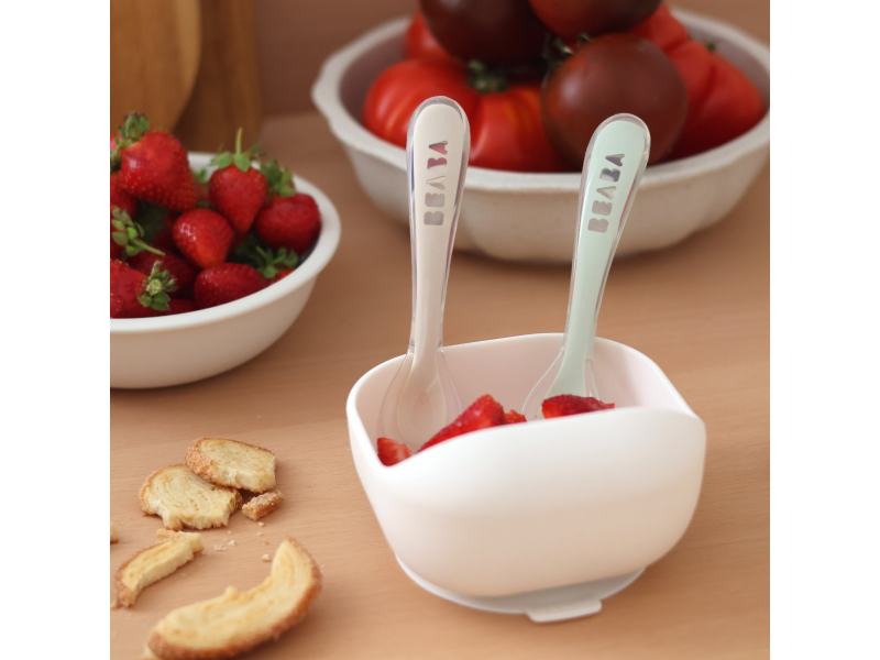 Silikonová lžička pro první samostatné krmení má ideální tvar pro dětská ústa. Tvar držadla usnadňuje dítěti držení lžičky. Integrovaná opěrka lžičky zabraňuje při položení lžičky na stůl kontaktu jídla se stolem a zajišťuje tak čistotu a hygienu. Praktické pouzdro umožňuje hygienické přenášení lžiček např. v přebalovací tašce. Lžičky jsou vyrobeny z vysoce kvalitního potravinářského silikonu. Možno mýt v myčce. Vhodné pro děti od 8 měsíců.