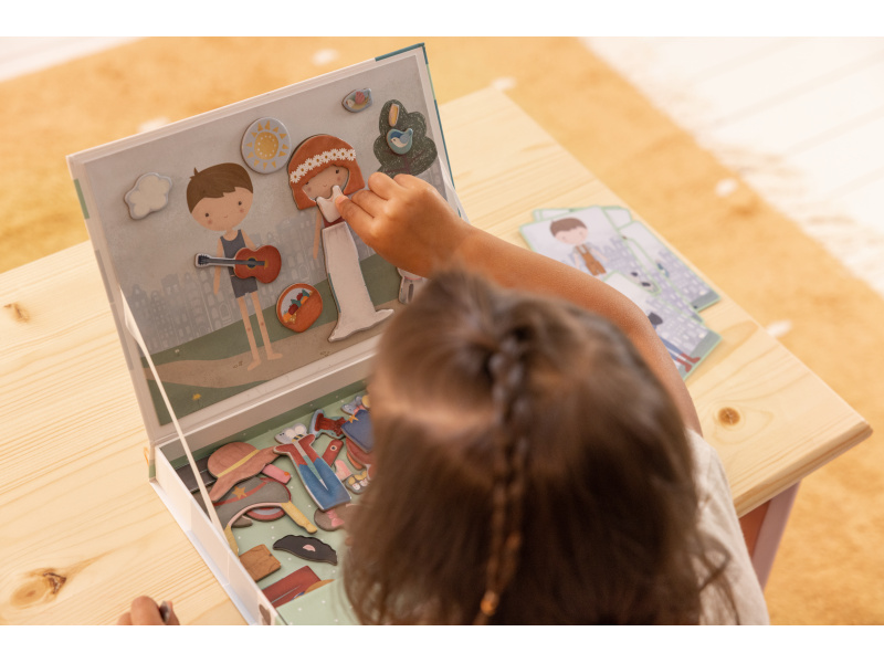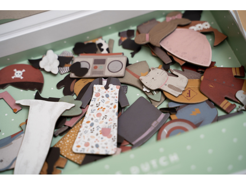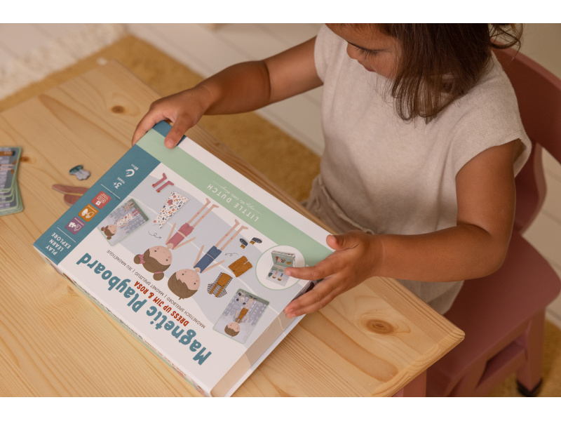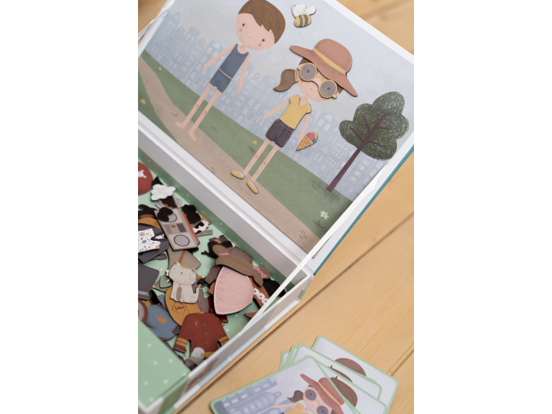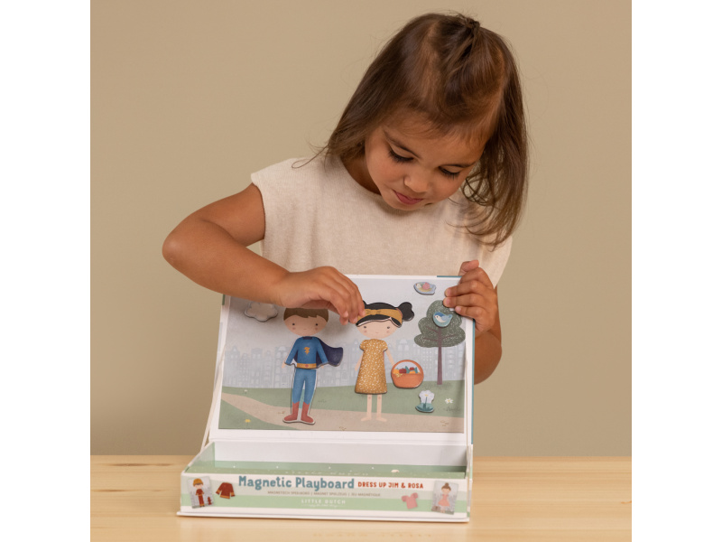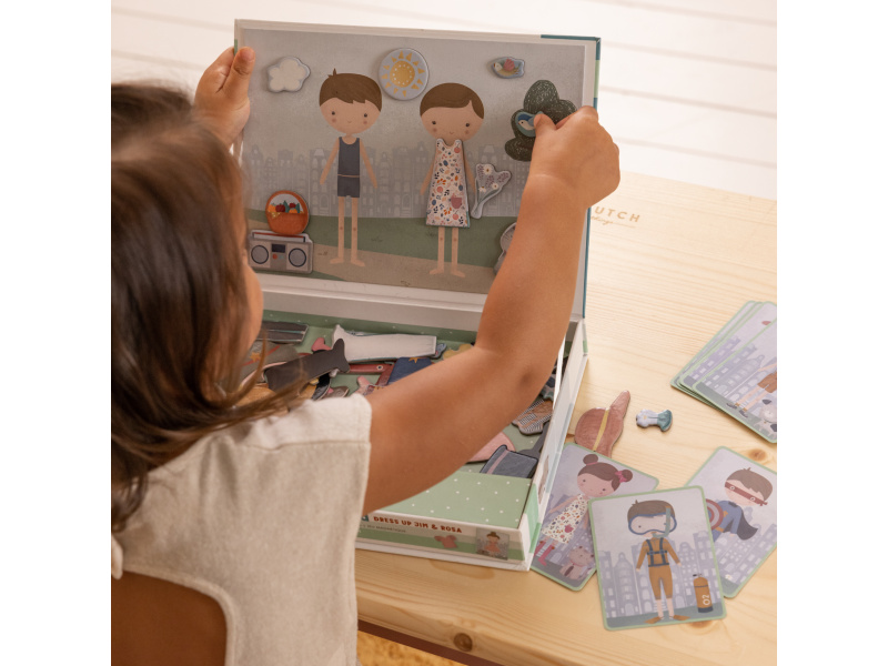 Oblečte Jima a Rosu! S touto magnetickou hrou může vaše dítě oblékat postavičky Jima a Rosy podle vzoru na kartě nebo použít vlastní fantazii a vytvářet své originální kombinace. Tato skvělá hra zabaví děti doma i na cestách. Magnetická hra se skládá z 80 magnetickcýh dílů, 6 karet pro Rosu a 6 pro Jima. Magnetické víko lze použít jako herní desku. Rozměry: 19 x 26 x 4,1 cm Vhodné pro děti od 3 let.