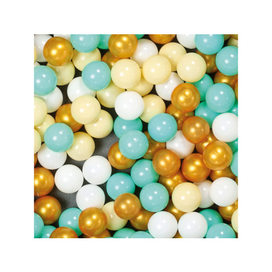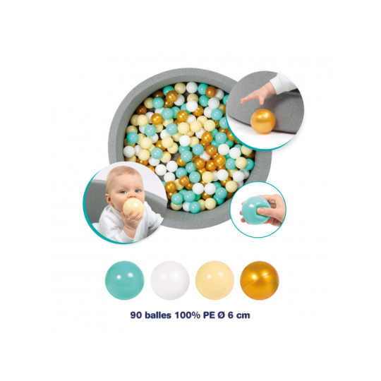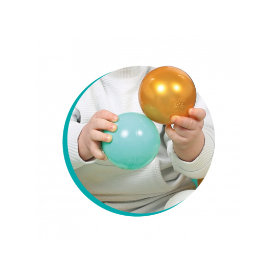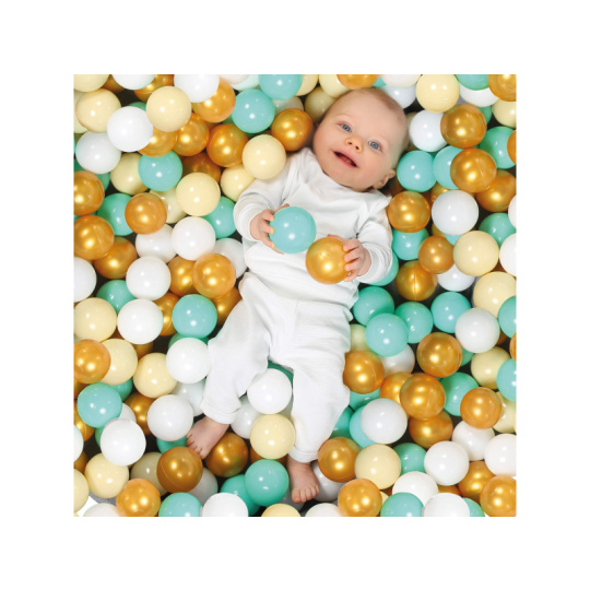 Sada 90 plastových míčků je ideální pro doplnění hracích ohrádek, bazénků nebo jako základ pro vlastní míčkový bazén. Měkký, ale odolný materiál zajišťuje bezpečné hraní i pro nejmenší. Díky průměru 6 cm se míčky dětem snadno drží, hází i mačkají – podporují tak rozvoj jemné motoriky a koordinace pohybu. Jemné odstíny ladí s každým interiérem: kombinace bílé, béžové, modré a zlaté vytváří elegantní a nadčasový vzhled, který si zamilují děti i rodiče. Balení obsahuje 90 míčků o průměru 6 cm. Složení: PE (polyethylen) Údržba: omyvatelné teplou vodou a mýdlem Vhodné pro děti od 6 měsíců.