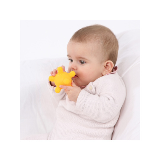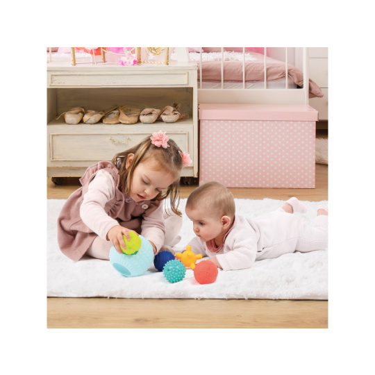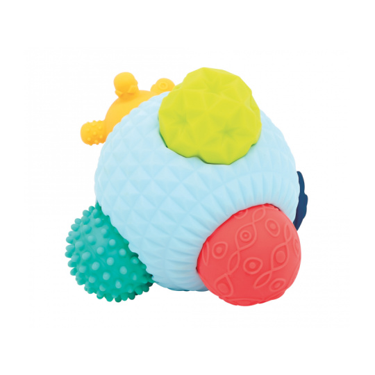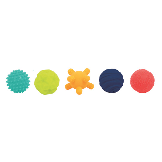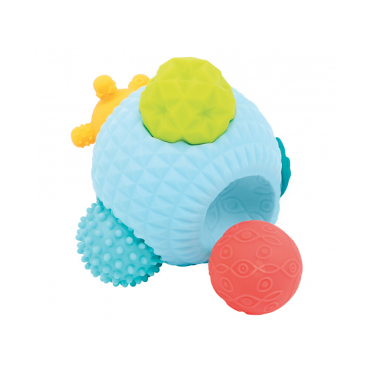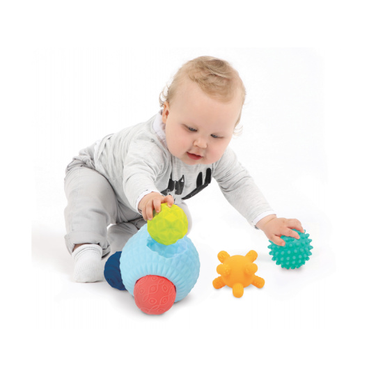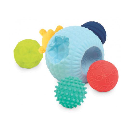 3D puzzle z míčků tvoří jeden velký míček s otvory a 5 menších míčků s různorodými texturami. Míčky, které se liší barvou, velikostí i povrchem povzbuzují dětskou zvědavost a lákají ke zkoumání. Každý míček pasuje do jednoho z pěti otvorů ve velkém míčku. Děti budou nadšeně malé míčky z otvorů vytahovat a pak se snažit je vrátit na své místo. Hračka pomáhá dítěti naučit se poznávat barvy a tvary a přispívá k rozvoji jemné motoriky, logiky a paměti. Rozměry: velký míček ø 12 cm, malé míčky ø 6,5 cm Vhodné pro děti od 6 měsíců.