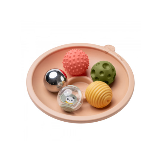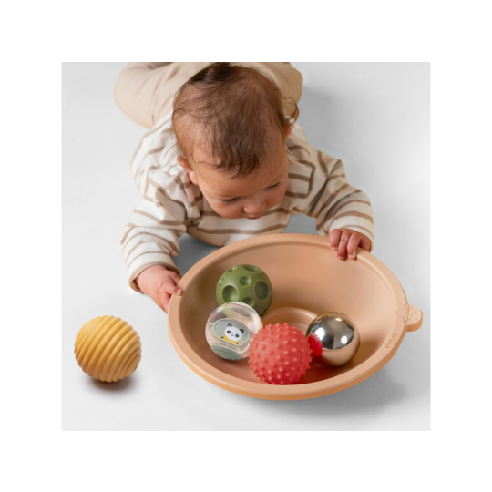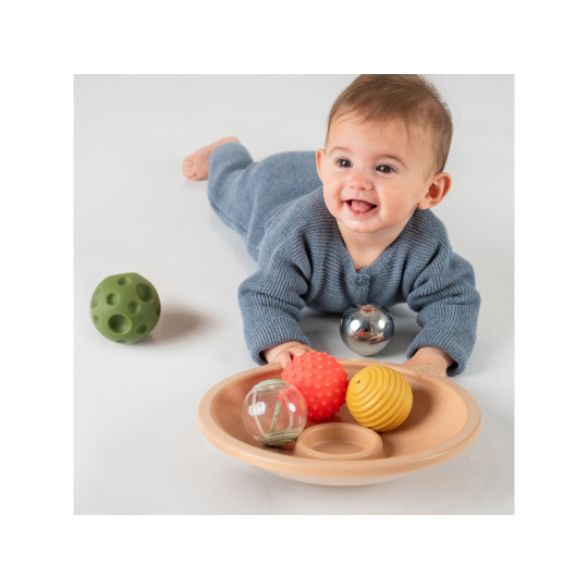 Interaktivní herní mísa s míčky byla navržena tak, aby zpříjemnila a prodloužila dobu, kterou miminko tráví na bříšku. Miska se jemně pohybuje při dotyku a motivuje dítě k aktivnímu pohybu, objevování a posilování svalů potřebných pro další motorický vývoj. Zábava, která podporuje pohyb: Zaoblené dno se při pohybu kývá, čímž podporuje vizuální sledování a zájem o okolí Miska aktivně motivuje dítě k natahování se, zvedání hlavy i ramínek a posiluje krk a horní část trupu Skvělý nástroj pro prodloužení a zpestření doby hraní na bříšku bez frustrace 5 senzorických míčků pro objevování: Nerezový míček s reflexním povrchem – podněcuje sebeuvědomění a sledování vlastního odrazu Průhledný otáčivý míček – vizuální stimulace a rozvoj koordinace oka 3 měkké texturované míčky s pískátkem – různé povrchy a zvuky podporují hmat, uchopování a objevování příčiny a následku Roste spolu s dítětem: 3v1 hrací funkce – podporuje dítě ve více vývojových fázích od pasivního sledování po aktivní zapojení Ideální pro první hru na bříšku i pozdější hraní v sedě Hladké a jemné zpracování vhodné i pro nejmenší ručky Vhodné pro děti od narození.