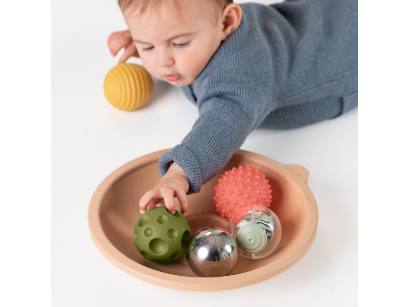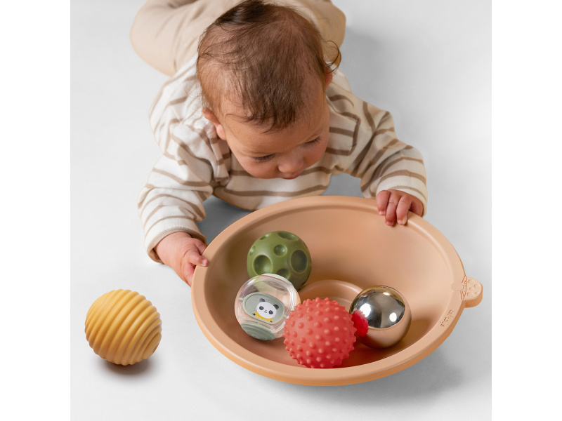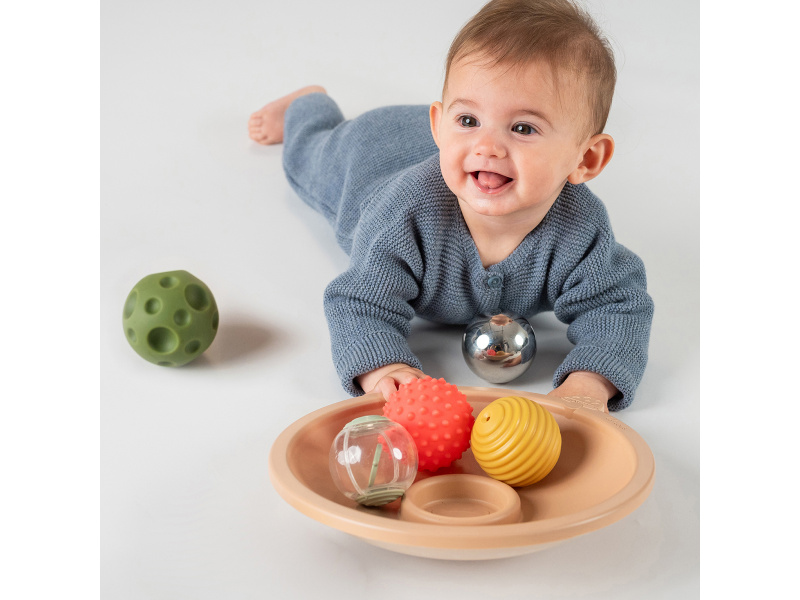 Interaktivní herní mísa s míčky byla navržena tak, aby zpříjemnila a prodloužila dobu, kterou miminko tráví na bříšku. Miska se jemně pohybuje při dotyku a motivuje dítě k aktivnímu pohybu, objevování a posilování svalů potřebných pro další motorický vývoj. Zábava, která podporuje pohyb: Zaoblené dno se při pohybu kývá, čímž podporuje vizuální sledování a zájem o okolí Miska aktivně motivuje dítě k natahování se, zvedání hlavy i ramínek a posiluje krk a horní část trupu Skvělý nástroj pro prodloužení a zpestření doby hraní na bříšku bez frustrace 5 senzorických míčků pro objevování: Nerezový míček s reflexním povrchem – podněcuje sebeuvědomění a sledování vlastního odrazu Průhledný otáčivý míček – vizuální stimulace a rozvoj koordinace oka 3 měkké texturované míčky s pískátkem – různé povrchy a zvuky podporují hmat, uchopování a objevování příčiny a následku Roste spolu s dítětem: 3v1 hrací funkce – podporuje dítě ve více vývojových fázích od pasivního sledování po aktivní zapojení Ideální pro první hru na bříšku i pozdější hraní v sedě Hladké a jemné zpracování vhodné i pro nejmenší ručky Vhodné pro děti od narození.