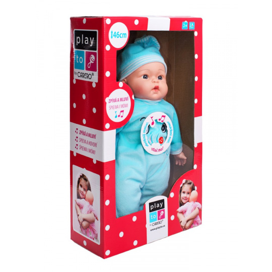Dětská panenka PlayTo. Hlava, ruce a nohy jsou vyrobeny z gumy, tělíčko pak z měkkého materiálu. Panenka má milou tvářičku, která vypadá jak opravdové miminko. Délka panenky je 46 cm a je zabalená v barevné krabici. Panenka má česky mluvící modul, který se nachází v kapsičce na bříšku. Modul po stisknutí přehrává 5 písní a mluví 14 českých vět.