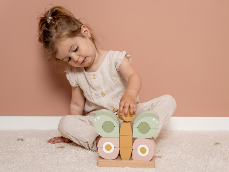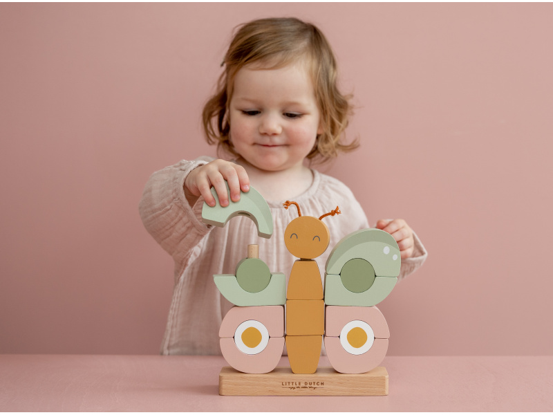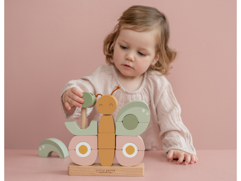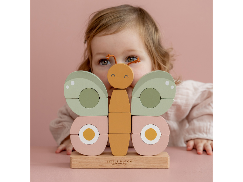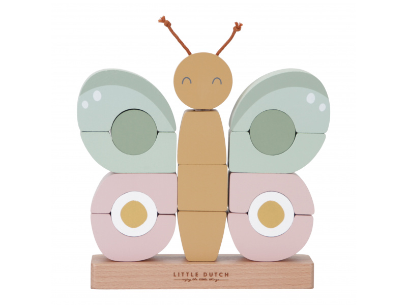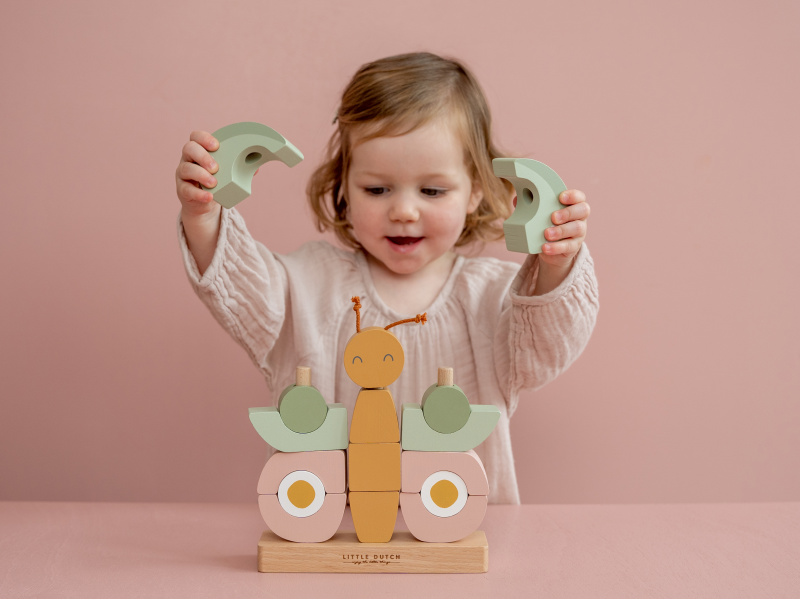 Originální dřevěný motýl je tvořen jednotlivýmí díly různých barev a tvarů, které se postupně navlékají na základnu. Hračka pomáhá rozvíjet jemnou motoriku dítěte a může sloužit i jako krásná dekorace v dětském pokoji. Vhodné pro děti od 18 měsíců.